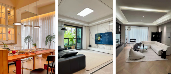 在燈具上偏好以無主燈營造大氣與高級氛圍,線條利落大氣,極具質感;又或選擇簡約的造型,沒有繁雜的裝飾,以達到極致的空間感與采光效果。