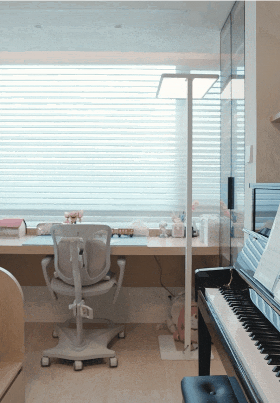 順著老人房,來到兒童房。靠窗的3m大長桌,家長可以坐在旁邊輔導作業。上方內置隱藏晾衣架,孩子白天上學時,趁機晾晾衣物。